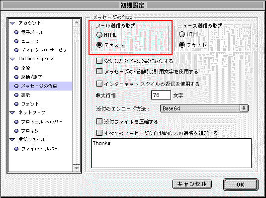 最近初心者の方がHTML形式でメールを送ってしまいトラブルになるケースが多発しております。iMacの標準のメーラーである Outlook Express も標準設定がHTML形式になっており、意識せずにHTML形式でメールを出してしまうことになります。なぜHTML形式がいけないのか、それによってどれだけ他の人が迷惑を被っているのか等は
