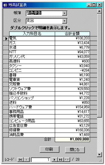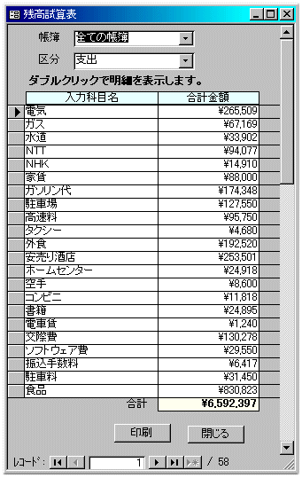 帳簿を「家計簿」で入力した伝票の集計です。