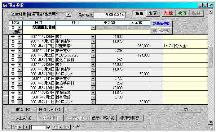 預金通帳の入力です。通帳に記載されている内容をそのまま入力できます。残高のチェックができるので、入力ミスを防げます。