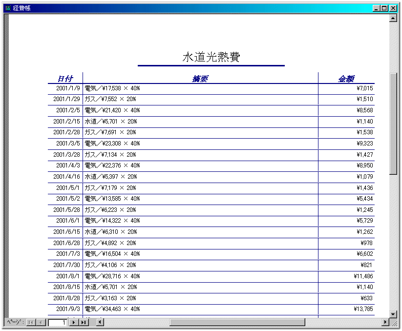 | 経費帳のサンプルです。 家計の支出の一部を事業用の経費にした場合、摘要に印刷されます。 |