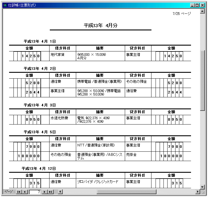 仕訳帳のサンプルです。 振替伝票形式で印刷されます。 |