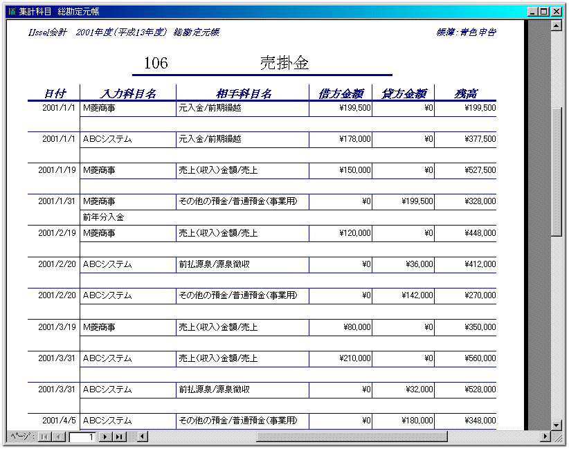 総勘定元帳のサンプルです。 集計定義で「売掛金」に集計した入力科目を使っている伝票が全て記載されます。 |