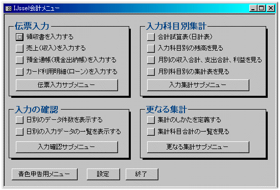 データファイルが作成されて、接続すると、基本メニューが表示されます。