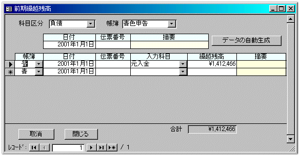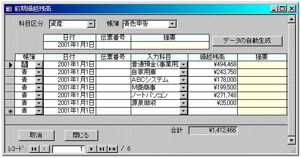 | (1) 「繰越残高」を起動します。 基本メニューの【伝票入力サブメニュー】→【繰越残高】を選択します。 (2) 資産の期首残高を入力します。 科目区分=「資産」、帳簿=「青色申告」、日付=期首日(決算年の1月1日)とします。 前年度の決算書の「貸借対照表」の「資産の部」の「期末」を見ながら、残高を入力します。 「事業主貸」は入力しません。 預金通帳は口座別残高を、売掛金は取引先別残高を入力して下さい。 合計が、前年度の決算書の資産の部の合計と合うことを確認して下さい。決算書に「事業主貸」がある場合は、その金額を引いた合計となります。 ![]() (3) 負債の期首残高を入力します。 科目区分=「負債」とします。 前年度の決算書の「貸借対照表」の「負債・資本の部」の「期末」を見ながら、残高を入力します。 「事業主借」と「青色申告特別控除前の所得金額」は入力しません。 買掛金は取引先別残高を、借入金は借入先別残高を入力して下さい。 「元入金」は資産の合計から負債の合計を引いた金額を入力します。これで、資産合計と負債合計が同じになることを確認して下さい。 ![]() |