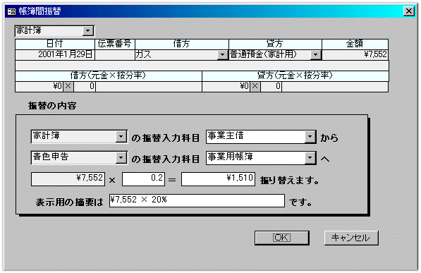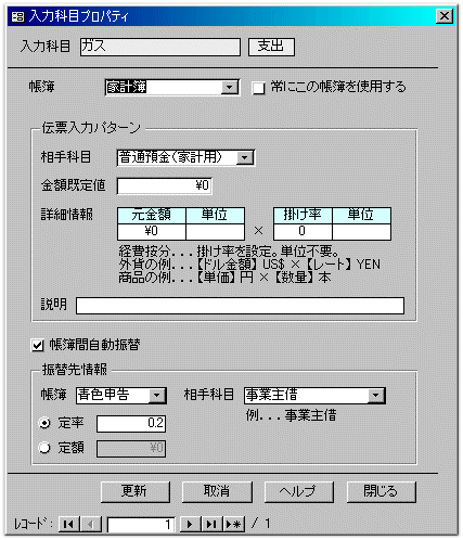 【新規】 ボタンが押されている状態で、続けて通帳の内容を入力します。 この口座の残高の管理はしなくてよいので、帳簿は、事業用の明細は「青」、それ以外は「家」とします。最新残高による入力チェックをしなくてよければ、事業用の明細だけの入力でもかまいません。 金額の一部を事業用経費にしたい科目が出てきたら... 【新規記帳】の前に、科目を右クリックして【プロパティ】を選択します。下の画面は「ガス代」の例です。 帳簿=「家計簿」です。常にこの帳簿を使用するをチェックすると、この科目を入力した時、帳簿が自動的に修正されます。また、金額既定値を登録すると入力時に自動表示します。 帳簿間自動振替のチェックをオンにします。 振替先情報は帳簿=「青色申告」、相手科目=「事業主借」です。 事業用経費に振り替える金額が、定率の場合は「定率」を選び、その率を入力します。この例では、ガス代の20%を事業用経費とします。また、一定金額を振り替える場合は「定額」を選び、その額を入力します。 詳しくは【ヘルプ】をご覧下さい。 設定が終わったら「入力科目プロパティ」の画面を閉じます。 この操作は2回目以降は必要ありません。 預金通帳の画面に戻り出金額を入力して【新規記帳】をすると、「帳簿間振替」の画面が表示されますので、振替の内容を確認して【OK】をクリックして下さい。この操作で、家計用支出の一部が事業用経費となります。 口座が複数あれば、全て同様にして入力して下さい。 |