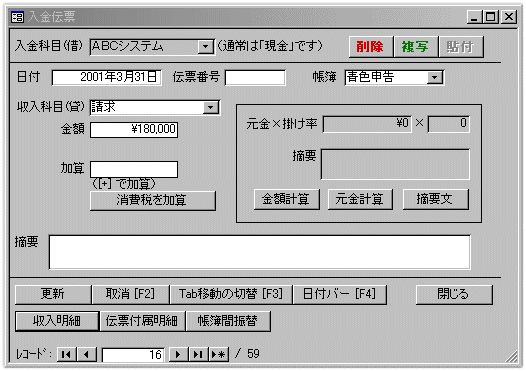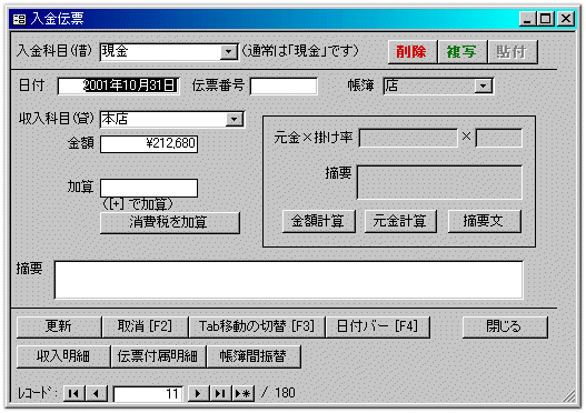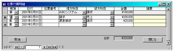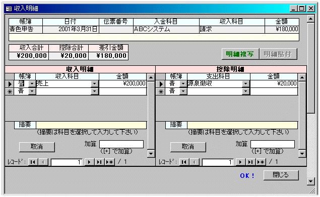 | 銀行口座への入金はすでに入力が終わっていますので入力の必要はありません。 ここでは、現金売上または売掛管理をする場合の売上(請求)を入力します。 入力方法は領収書の入力と同様です。 現金売上の入力 入金科目(借)=「現金」で入力します。 売掛管理をしている場合の売上の入力 入金科目(借)=取引先名で入力します。 源泉徴収がある場合の入力 入金科目(借)=取引先名(又は現金)、収入科目(貸)=仮勘定(ここでは「請求」)で入力し、金額は源泉分を差し引いた入金予定額を入力します。 【更新】ボタンをクリックした後、【収入明細】ボタンをクリックして「収入明細」の画面を起動します。 収入明細に「売上」を、控除明細に「源泉徴収」を入力し、差引金額が入金(予定)額と合うようにします。 「値引き」や「交通費支給」などの入金額を算出するためのデータもここで入力できます。 金額が合うと「OK!」と表示されますので画面を閉じます。 ![]() 「入金伝票」画面の【伝票付属明細】で仕訳を確認すると、次の画面のようになります。 「請求」は残高がゼロになり、「ABCシステム」\180000、「売上」\200000、「源泉徴収」\20000、となります。 ちなみに、「源泉徴収」は所得税の前払いなので、資産科目となります。 ![]() |