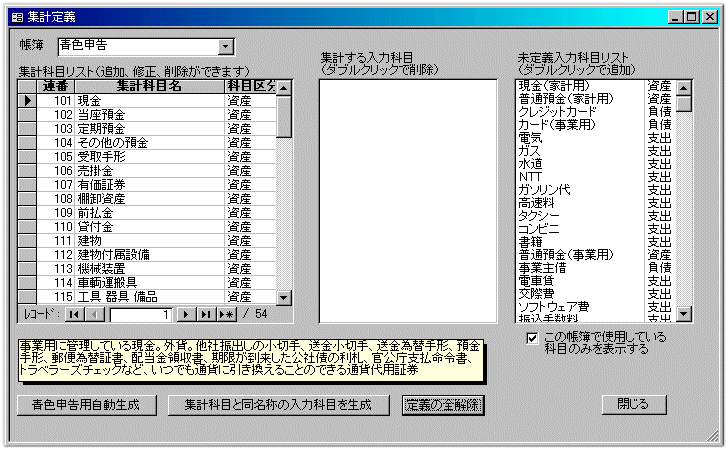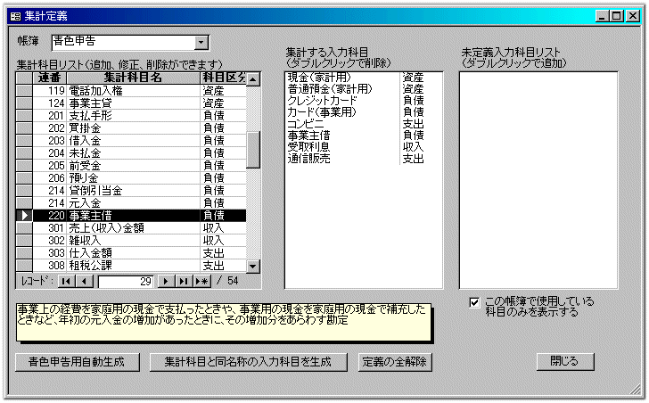 | 基本メニューの【青色申告用メニュー】→【集計定義】で「集計定義」を起動します。 【集計科目リスト】には、すでに青色申告の決算書に印刷されている勘定科目が登録されています。経費などオリジナルの科目がある場合は追加して下さい。 集計科目を選択し、そこに集計する入力科目を「未定義入力科目リスト」の中から選んでダブルクリックして下さい。中央の「集計する入力科目」に移動します。 「未定義入力科目リスト」が空っぽになるよう全ての入力科目を定義して下さい。 家計用の科目は「事業主借」または「事業主貸」に集計します。例えば、事業用の銀行口座から家計用の「生命保険料」を引落している場合は、「生命保険料」は「事業主貸」になります。また家計用の銀行口座は「事業主借」になります。 ![]() 全ての定義が終わったら、「青色申告メニュー」に戻り【チェック】ボタンをクリックして下さい。 「設定に問題は発見されませんでした」と表示されれば、とりあえずはOKです。 集計科目リストの科目区分が「資産」「負債」の集計科目に集計している入力科目で、帳簿が「青色申告」以外の伝票があると、チェックでエラーになります。この場合は、基本メニューの【入力集計サブメニュー】→【現預金、カード、ローンの残高を調べる】を使って、原因を調べる事ができます。 |
